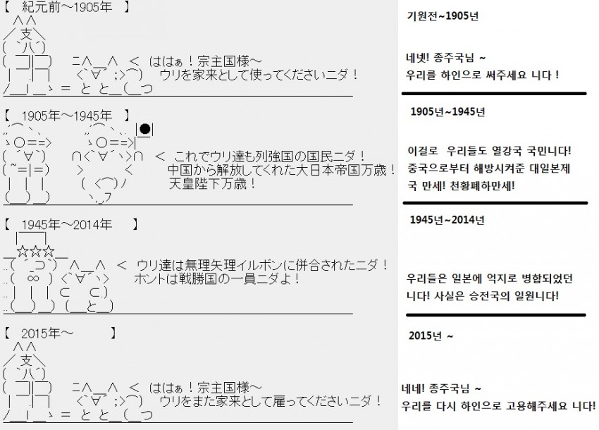 <丶`∀´> "일본은 전쟁에서 졌어NIDA! 따라서 일본은 이제 노예! 우리는 강제로 일본편에서 싸웠다. 하지만 사실 우리는 연합국 NIDA! 쪽바리 녀석들 우리에게 복종해 NIDA!ウェーハハハ!!"