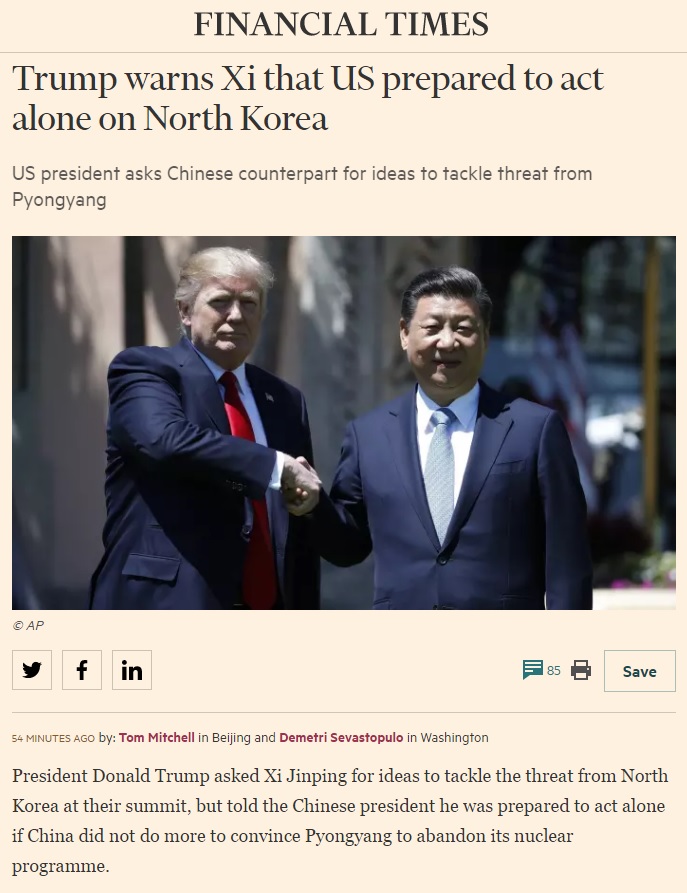 2. 트럼프가, 시진핑에게, 네가 북한과의 관계 때문에 협조하기 곤란한 것을 안다. 모두 이해한다... 라고 말했다. ( we understand it creates unique problems for them and challenges )