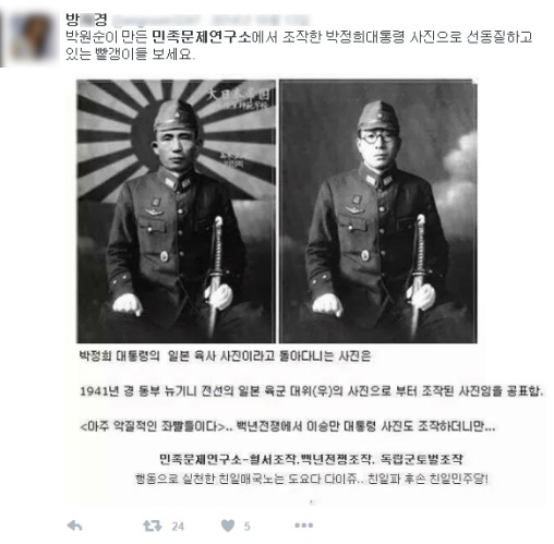 이 사진은 2013년, 욱일승천기를 자신의 SNS에 올렸다가 내한공연이 취소된 일본 아이돌 ‘캬리 파뮤파뮤’의 일본팬이 항의의 표시로 인터넷에 올린 박정희 합성사진이었다.