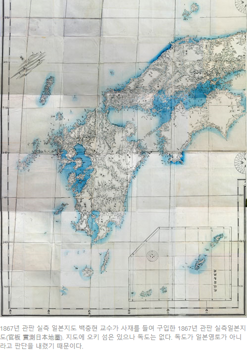 ベク・チュンヒョン教授が私財を投じて購入した1867年官版実測日本地図(官板實測日本地圖)。この資料には隠岐島はあるが、独島はない。日本が、独島が日本領土でないと判断を下したためだ。