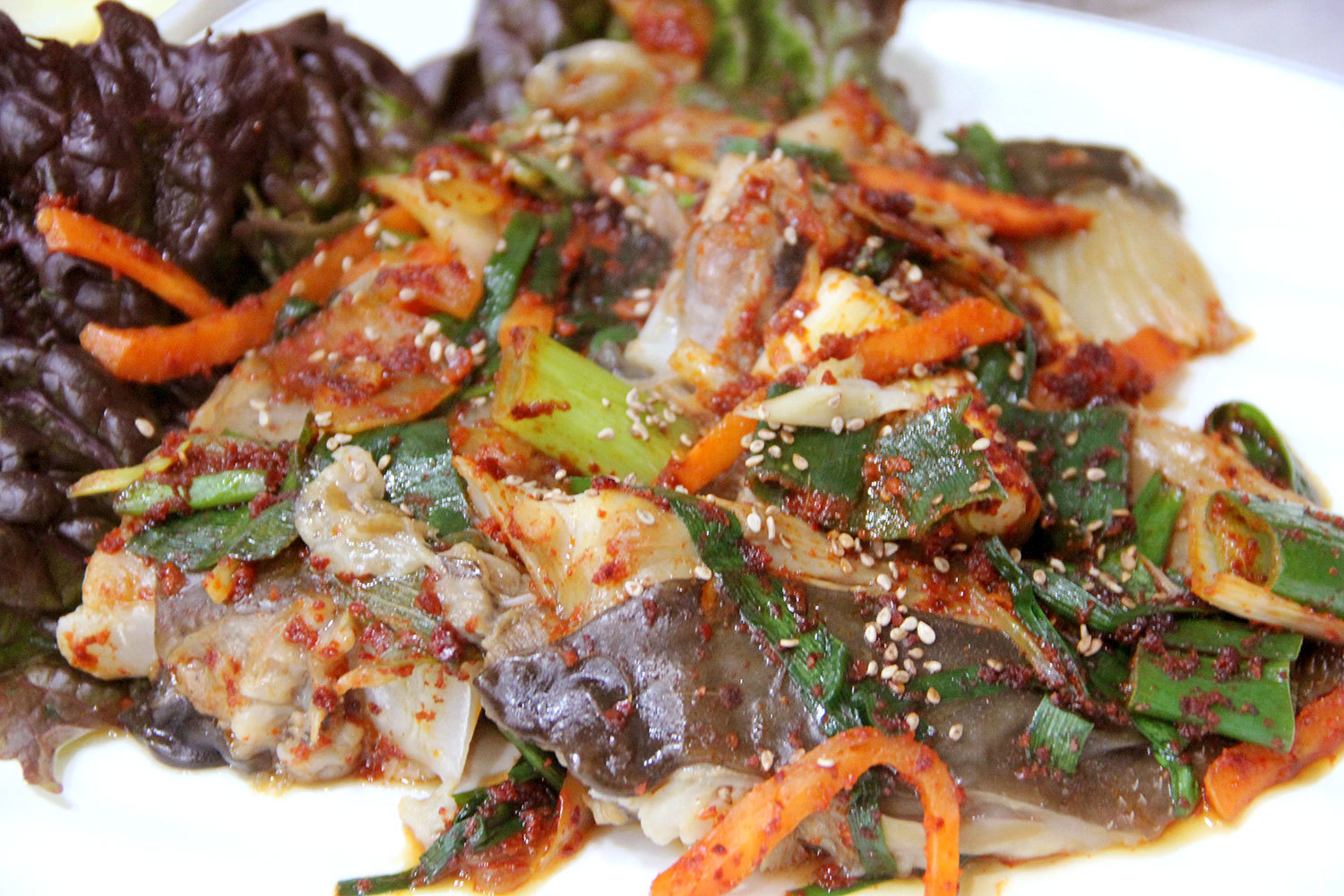 締めにホンオのチム(蒸し料理)を頼んだ。大皿に、ネギ、ニンジン、ニラが入っており、遠目にはふつうの魚の蒸し料理に見える。だが、スプーン一杯分の塊をとって口に入れると強烈。湯気と一緒にアンモニア・スパークリングがジュワーッと口から喉、鼻と呼吸器に充満するのだ。飲み込んでも胃から臭気が逆流してくるので、急いでマッコルリを流し込む。