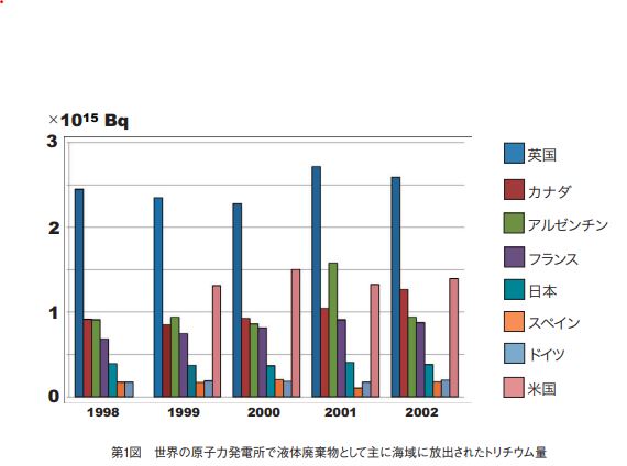 図は世界の原子力発電所で液体廃棄物として主に海域に放出されたトリチウム量