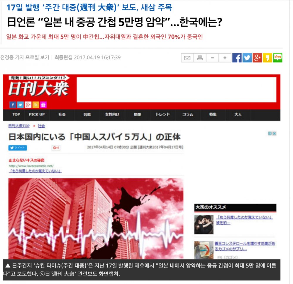 한국과 일본 양국에 지나 공산당 스파이 5만명 활약 중