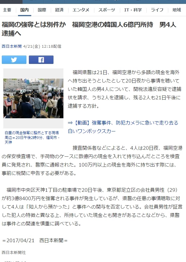 ただ事実として、「福岡で3.8億円が強奪された」ということと、別件で「福岡空港で韓国人が7億円を不正に持ち出そうとした」というだけです。
