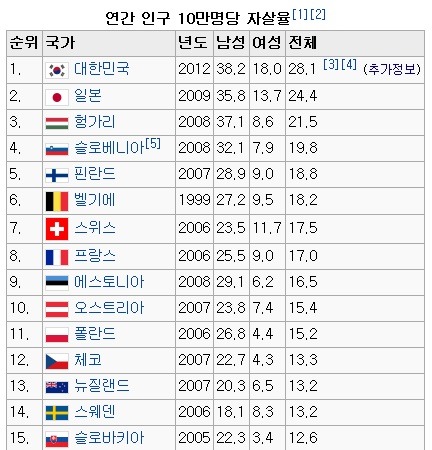 それよりも韓国の自殺率は異常ですね。中進国の中では韓国だけがランクインしてるのではないでしょうか。15~5年程前は 友人知人が どんどん 練炭や ドアノブネクタイで