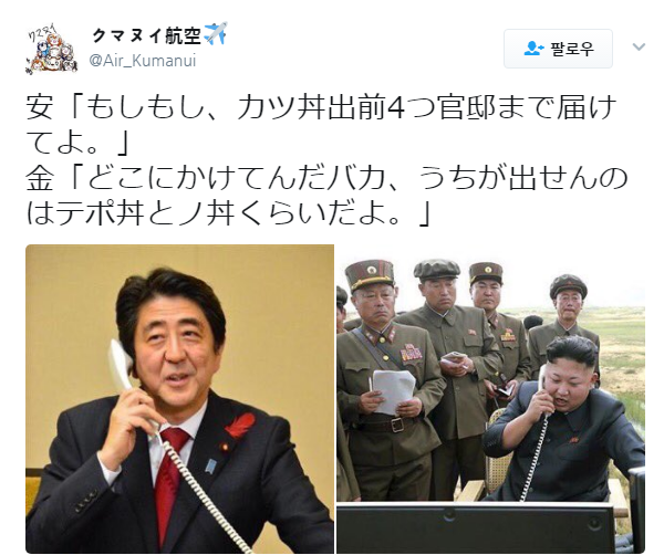 1hysolid2017/04/24(Mon) 21:46:52ID:c2NTE5MTI(1/2)NG報告아베 여보세요, 가츠동 4개 관저까지 배달해주세요김정은 잘못걸었어 임마. 우린 대포동이랑 로동밖에 취급안해>>5>>388