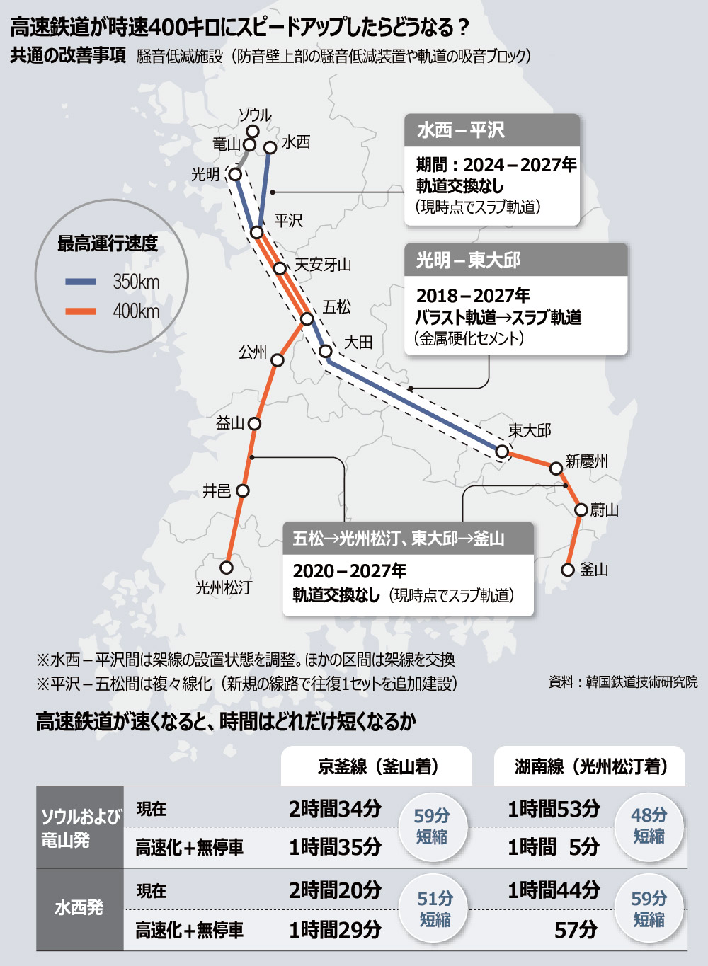 早ければ2027年に、ソウルー釜山間を最高時速400キロ、わずか1時間30分で結ぶ「次世代高速鉄道」が登場する見込みだ。ソウル-光州間は1時間前後で走破できる。韓国の国土交通部(省に相当。国土部)は、現在最高時速300キロで走っている高速鉄道を区間ごとに時速350-400キロまで高速化する案を、27年までにかけて推進する。25日に国土部が発表した。