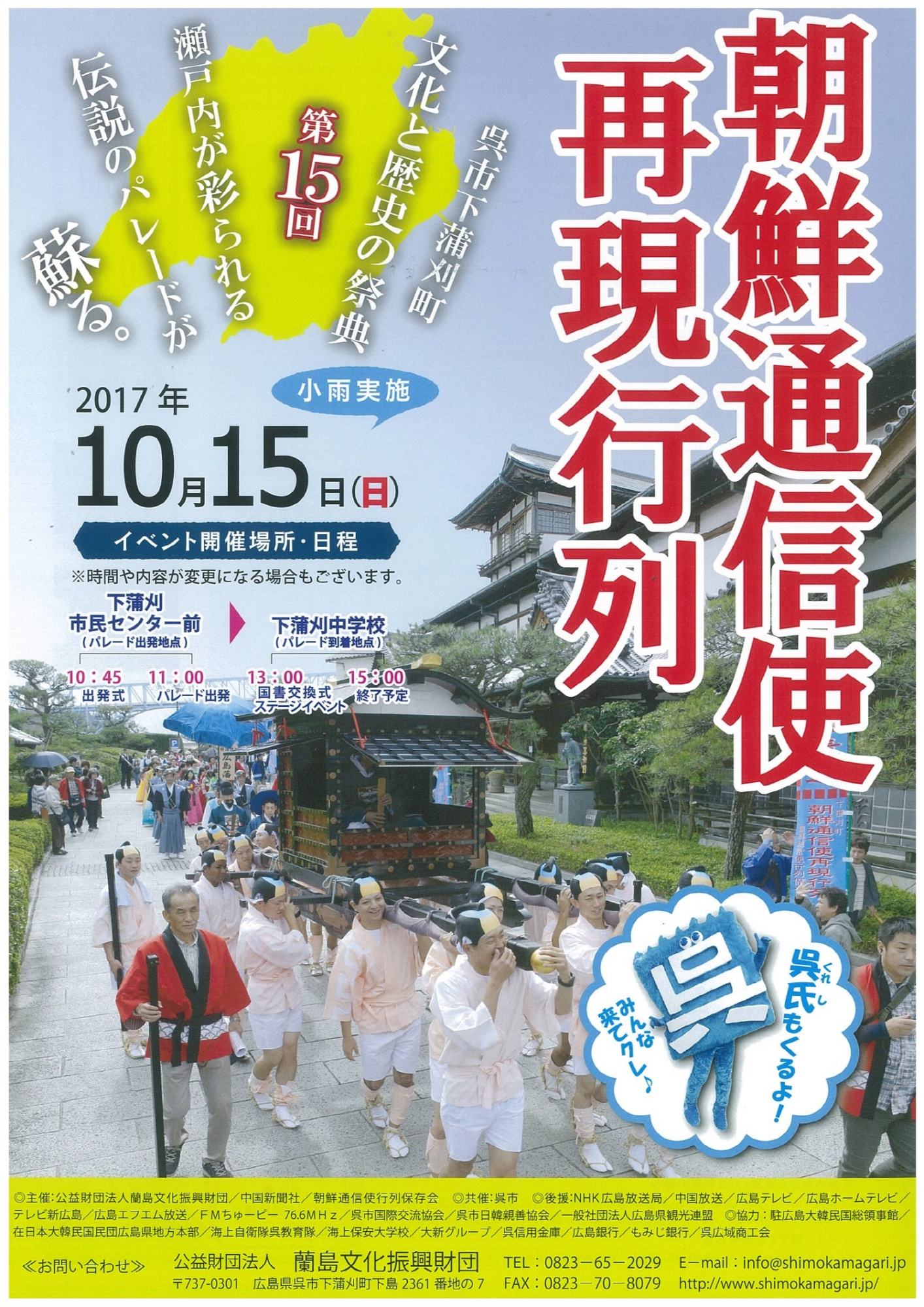 下蒲刈島は古くから瀬戸内海航路の要衝として栄え、江戸時代には親善友好使節団であった「朝鮮通信使」の一行を出迎える地としても知られています。朝鮮通信使一行がこの地を訪れた際には、藩をあげて、島をあげての盛大なもてなしを行い、その様子は「島が沈むほど」と表現されています。このイベントでは、色とりどりの再現衣装を見にまとった約250人の参加者が、当時の様子をパレードとして再現します。