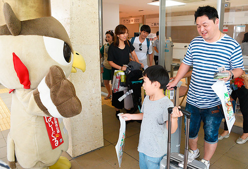 国際線の到着口では、大きな荷物を手にした乗客48人を、漫画「名探偵コナン」の主人公の着ぐるみや県庁職員らが拍手で出迎えた。