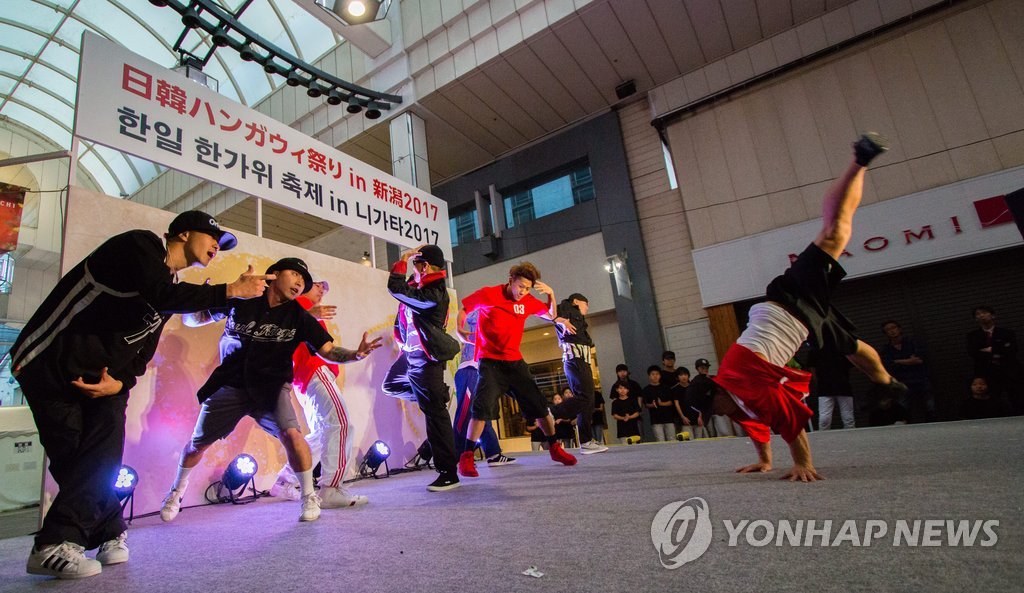(니가타=연합뉴스) 일본 니가타(新潟)현 니가타시 후루마치에서 지난달 30일 열린 '한일 한가위 축제 in 니가타'에서 참석자들이 케이팝(K-POP) 댄스를 선보이고 있다. 2017.10.1 [주니가타 총영사관 제공=연합뉴스] [email protected]>>988