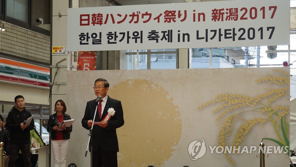 (니가타=연합뉴스) 조건희 니가타(新潟) 주재 대한민국 총영사가 지난달 30일 일본 니가타현 니가타시에서 열린 '한일 한가위 축제 in 니가타'에서 인사말을 하고 있다. 2017.10.1 [주니가타 총영사관 제공=연합뉴스] [email protected]