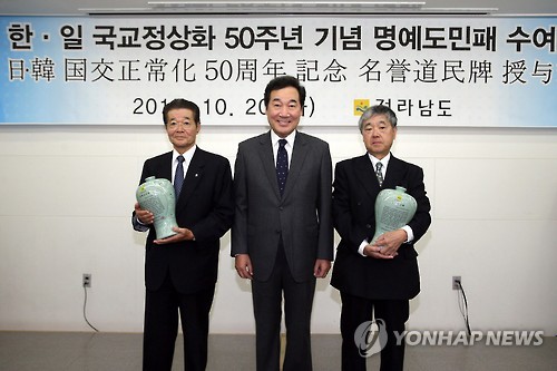 韓国南西部の全羅南道は20日、韓日国交正常化50周年を記念して、元高知県議員の西森潮三氏と日刊ゲンダイの記者である太刀川正樹氏に名誉道民の称号と記念品を贈呈した。