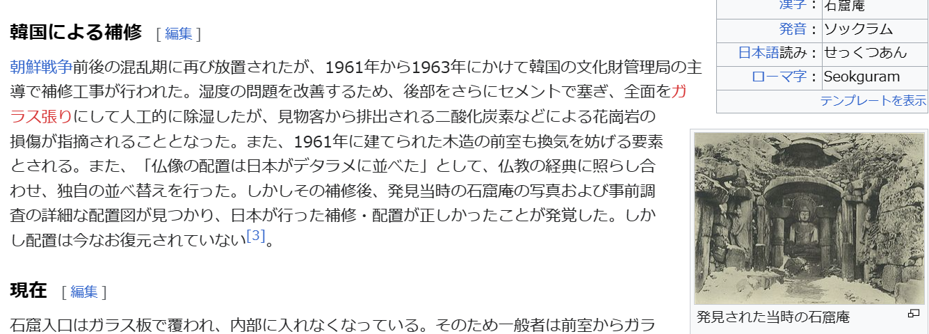 『石窟庵』は日本が見つけ修繕しなければ、そのまま朽ちていたでしょうね。李氏朝鮮時代の仏教弾圧でとことん仏教は弾圧されて高麗にあった仏教文化を棄損していたので。当時の朝鮮人には価値がまったくないものだったんですね。일본이 나쁜 이유는 한국의 정신을 말살시키기 위해 고의적으로 문화재를 변형하여 훼손 시켰기 때문 입니다