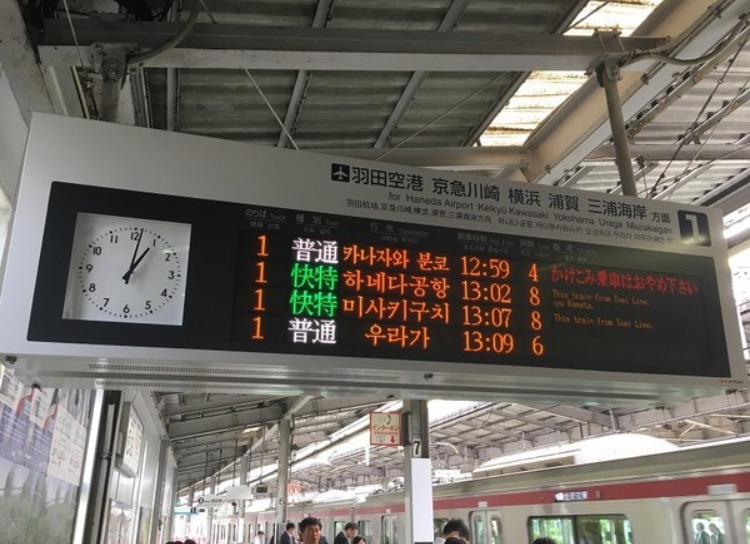 京浜急行の行先案内板が「面白い」と聞いていたので5月16日に確認に出かけた。案内板には、およそ40秒の間に、日本語→英語→中国語→日本語→英語→韓国語の順番で行き先が表示される。韓国語で表示した瞬間を写真に撮った。