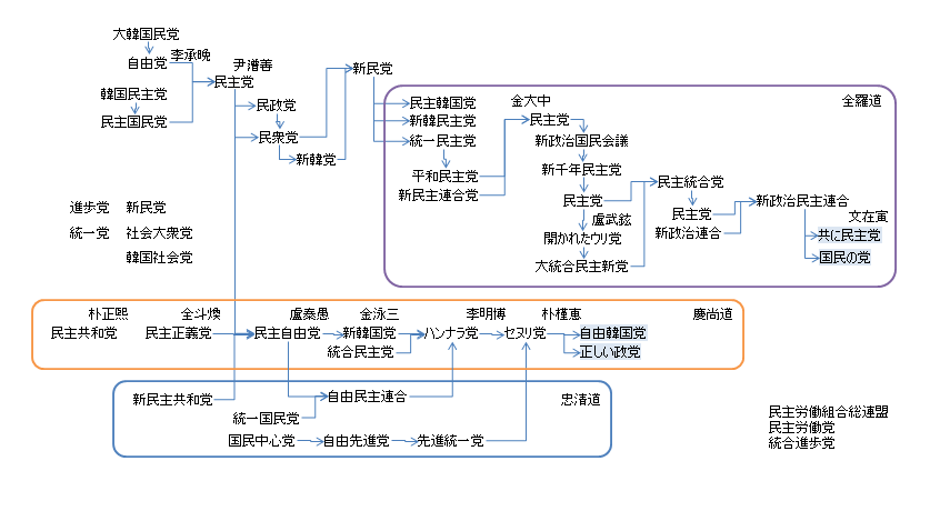 https://ja.wikipedia.org/wiki/%E9%9F%93%E5%9B%BD%E3%81%AE%E6%94%BF%E5%85%9A%E4%B8%80%E8%A6%A7もういっそ、全羅道党とか、慶尚道党とかでいいんじゃないか。