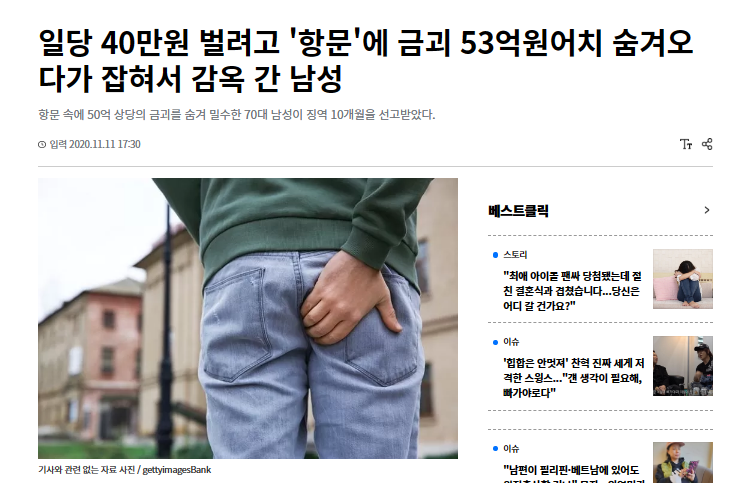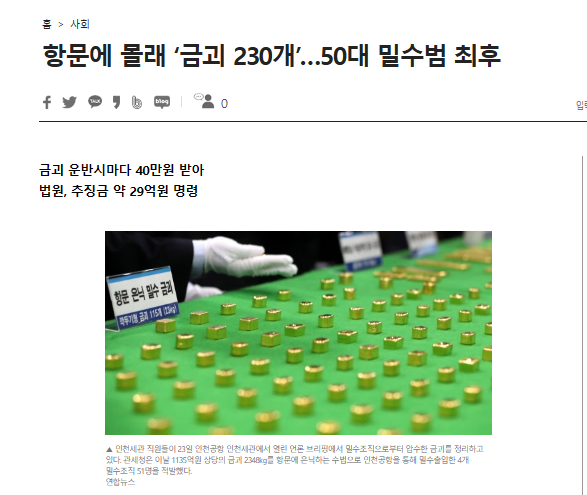 肛門の中に金塊を隠す手口で、約2年間で1000億ウォン以上の金を密輸した50人余りの