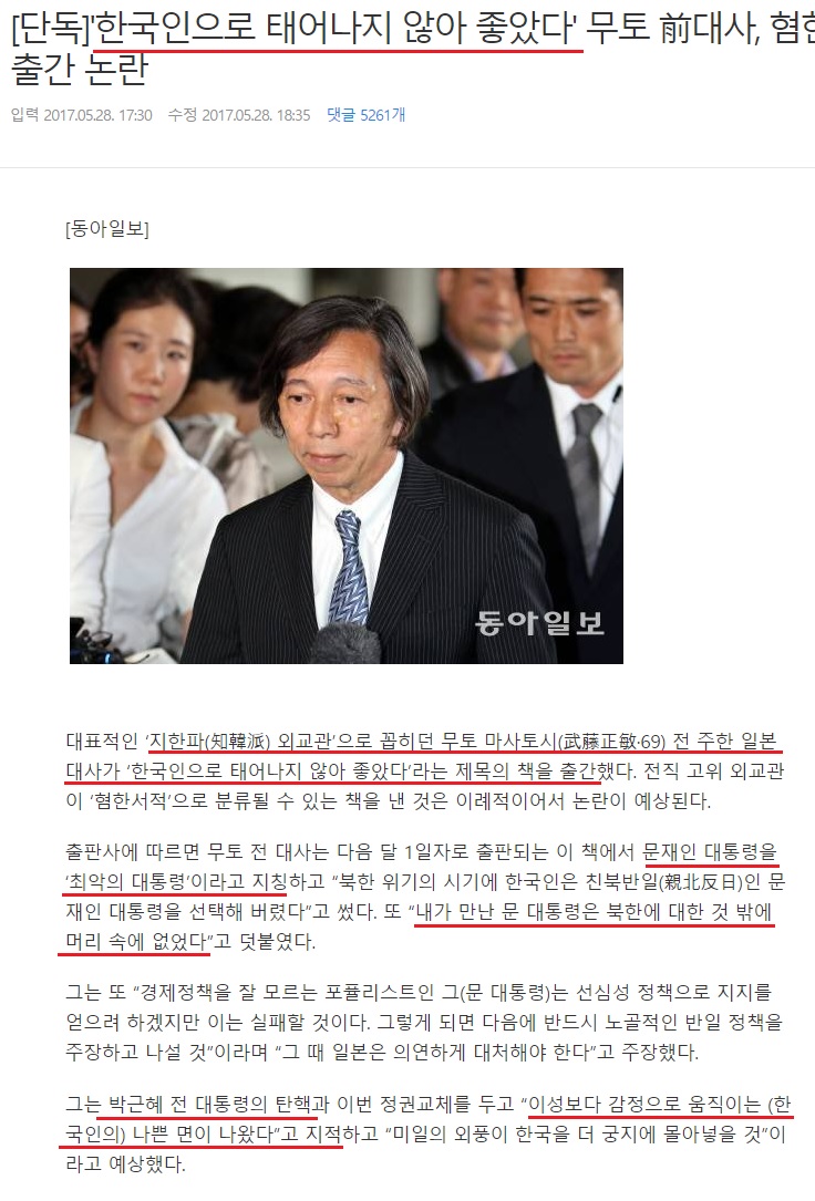 대표적인 지한파 외교관으로 꼽히던 무토 마사토시 전 주한 일본대사가 한국인으로 태어나지 않아 좋았다'라는 제목의 책을 출간했다. 전직 고위 외교관이 '혐한서적'으로 분류될 수 있는 책을 낸 것은 이례적이여서 논란이 예상된다.