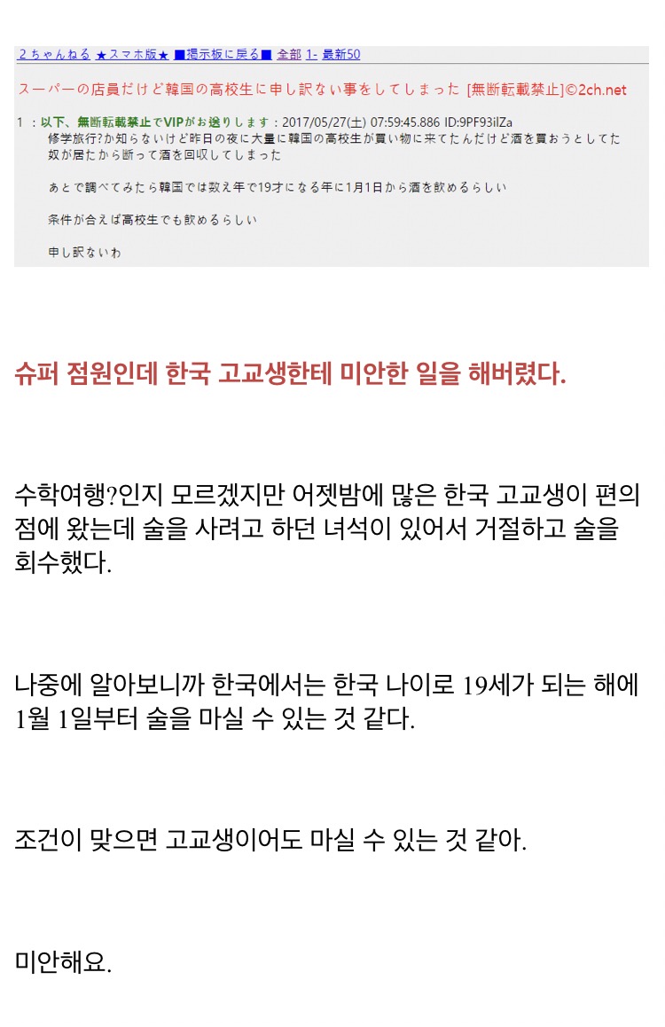 1hysolid2017/05/28(Sun) 22:59:45ID:g2Mzc2NjQ(1/1)NG報告.>>3>>7>>802名無し2017/05/29(Mon) 01:29:58ID:E3MTkyOTQ(1/1)NG報告韓国の法律では20歳未満の飲酒が許されようとも、日本に旅行中なら日本の法律に従う義務がある。酒屋の判断は正しい。酒を提供したら、酒屋が罪に問われます。143名無し2017/05/29(Mon) 01:53:34ID:MyNTEyMDI(1/1)NG報告>>1아닙니다. 만 19세 입니다. 일본 나이로 21살 생일 지난 후에 가능합니다.학생이 나쁘군요. 그냥 19세와 만 19세는 다릅니다. 한국은 태어나자 마자 1살입니다. 엄마 뱃속 기간을 1년으로 생각하는 것입니다.일본 나이로 21살 생일 지나야 술을 마실 수 있습니다. 일본도 생각보다 철저하네요. 여기서 미스테리 미성년자 담배는 도대체 누가 사주는 것인가?>>414ミミズク岩で逢おう◆8femuqvbsw2017/05/29(Mon) 01:57:35ID:MxODc1NjI(1/2)NG報告>>3未成年に酒タバコを販売することが発覚すると売った店員に500000以下の罰金+経営者にも同額の罰金+酒類(タバコ)販売免許剥奪です。>>555ミミズク岩で逢おう◆8femuqvbsw2017/05/29(Mon) 01:58:11ID:MxODc1NjI(2/2)NG報告>>4500000円ね06名無し2017/05/29(Mon) 04:25:45ID:U4NDY4Nw=(1/1)NG報告그 고등학생은 훗날 일본을 증오하게 됩니다.>>727名無し2017/05/29(Mon) 05:08:47ID:M0MDM2NzM(1/1)NG報告>>1>>6韓国の修学旅行は何を勉強しに日本へ来るの?48名無し2017/05/29(Mon) 05:25:56ID:gyMjAwNzg(1/1)NG報告>>1저 고등학생은 한국 법률로도 술 못마셔 ㅋㅋ미안해 할 필요가 전혀 없다.일본 법률을 무시 + 한국 법률상 음주불가능59名無し2017/05/29(Mon) 10:16:15ID:k5ODc5NzU(1/1)NG報告未成年という話を別にしても、修学旅行中にお酒を飲んだらまずいのは韓国でも同じじゃないの?日本の学校なら ばれたら停学だな。停学に陥るところを助けてやったんじゃないか?3