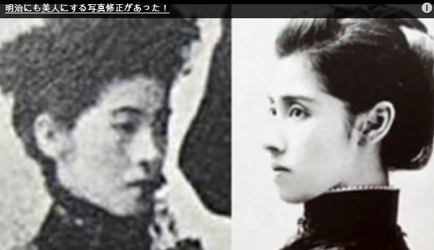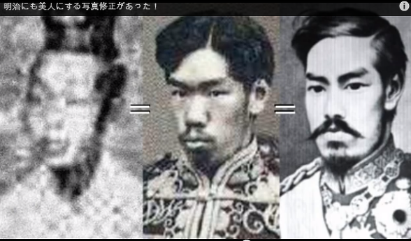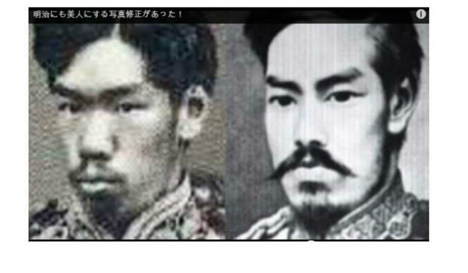 그래서 일본은 자신들의 외모를 날조하기 시작했다. 컴퓨터가 없을 때, 사진 현상 단계에서 핀셋이나 면봉, 바늘로 긁거나 덧칠해서 요즘의 포토샵 같은 효과를 얻었다. 특히 얼굴을 백인처럼 위장했다. 유인원(왼쪽)에서 인간(오른쪽)으로 진화가 일어났다.火病を起こしてるね