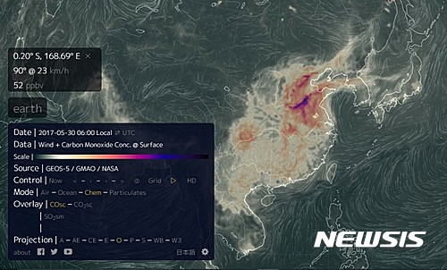 뉴스 사이트 대기원(大紀元)은 30일 지구 대기흐름 보여주는 사이트 구글 어스 눌스쿨(earth.nullschool)을 인용해 중국에서 일산화탄소가 대거 한반도 등으로 퍼지고 있다고 보도했다.