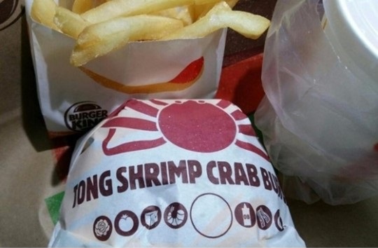 そのハンバーガーの包み紙にはズワイガニのイラストが描かれており、旭日旗に見える。