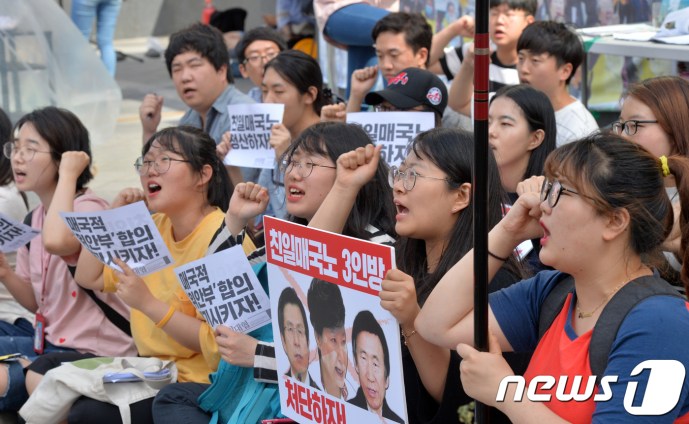(서울=뉴스1) 김명섭 기자 = 3일 오후 서울 종로구 소녀상 옆에서 열린 매국적 한일 위안부 합의 전면 폐기를 위한 토요집회에서 참가자들이 구호를 외치고 있다. 이날 싱가포르 샹그릴라 호텔에서 열린 아시아안보회의에서 이나다 일본 방위상이 위안부 문제는 한일 양국간 최종 합의가 됐고 일본의 역할과 의무는 다했다고 밝혀 논란이 일고 있다. 2017.6.3/뉴스1