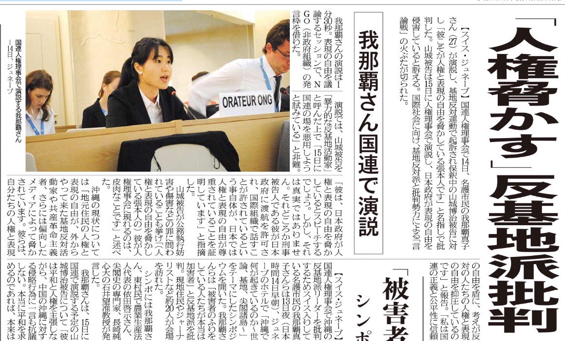 沖縄のメディアが変なのは同意します。【スイス・ジュネーブ】沖縄の反基地派リーダー で、傷害罪などで起訴された山城博治被告が15 日、スイス・ジュネーブの国連人権理事会で演説 するのに先立ち、名護市民の我那覇真子さん (27)が13日ごろ、同理事会で演説し、山城被告 を名指して批判する。
