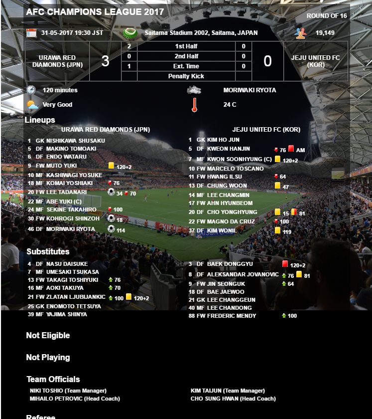 무토 유키가 제주 벤치를 향해 손가락 욕설을 날렸다. 이를 지켜보던 우라와 직원이 경기장에 들아와 무토를 말렸다. 주심은 권순형과 즐라탄에게 엘로우카드를 준 것에 이어 부심의 권고에 따라 무토에게 경고를 줬다. 직원은 그라운드에 들어올 수 없지만 어수선한 정황에 그대로 넘어갔다. 경기 종료 휘슬이 울린 뒤에는 우라와 스태프까지 도발에 가세했다. 제주 벤치를 향해 소리를 지르며 물을 뿌리고 물병까지 바닥에 내던졌다>>31