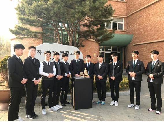 仁川市立新松高校の生徒たちが「小さな平和の少女像」を校庭に設置し、記念撮影をしている=新松高校生徒会提供//ハンギョレ新聞社日本の朝鮮学校や韓国学校にも設置したら?
