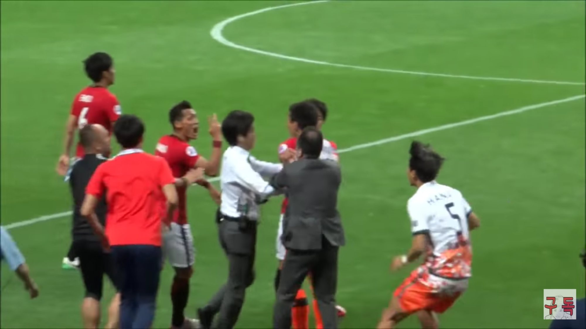 サッカー好きが多い国ほど、韓国のことを嫌っている。例えばドイツ、フランス、イタリア。권순형이 상대 선수들과 신경전을 펼치는데 즐라탄이 손가락으로 3대0 스코어를 만들면서 '너넨 끝났다'고 하더라. F가 들어가는 욕도 했다. 확인이 필요하지만 인종차별적 발언을 들은 선수도 있었다. 당연히 기분이 나쁠 수 밖에 없지 않나. 백동규가 그 과정을 멀리서 보는데 당하고 있다고 생각이 들었다더라. 그래서 말리려고 뛰어들다가 엉뚱한 선수를 가격한 꼴이 됐다"고 했다. 백동규는 퇴장을 당했다. 화면에는 잡히지 않았지만 이 과정에서 무토 유키가 제주 벤치를 향해 손가락 욕설도 날렸다. 제주 선수들은 흥분했지만, 이를 확인한 대기심이 무토에게 경고를 주며 일단락됐다.
