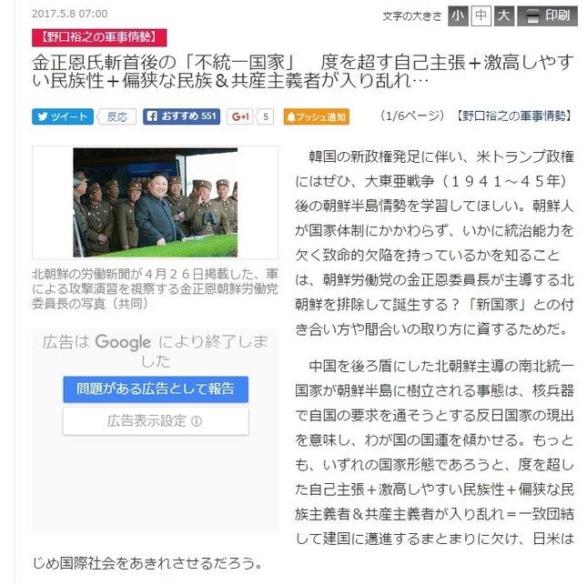 産経新聞がウェブサイトに掲載した朝鮮半島情勢に関する連載記事で、「朝鮮人」が「統治能力を欠く致命的欠陥を持っている」などと持論を展開し、波紋を広げている。こういった表現が「特定の民族を侮蔑するような表現」だという指摘が出ている。この記事はヤフーにも配信されていたが、この「侮蔑表現」指摘の数日後に記事が削除された。
