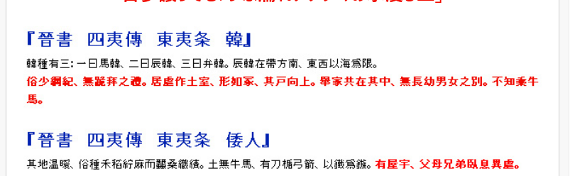 「その土地は温暖で、一般に稲を植え、麻や桑を栽培して織物を作る。日本には牛や馬は棲息しておらず、刀や楯、弓矢がある。鏃は鉄でできている。家がある。父母兄弟はそれぞれ別の部屋で寝起きする。」>>963