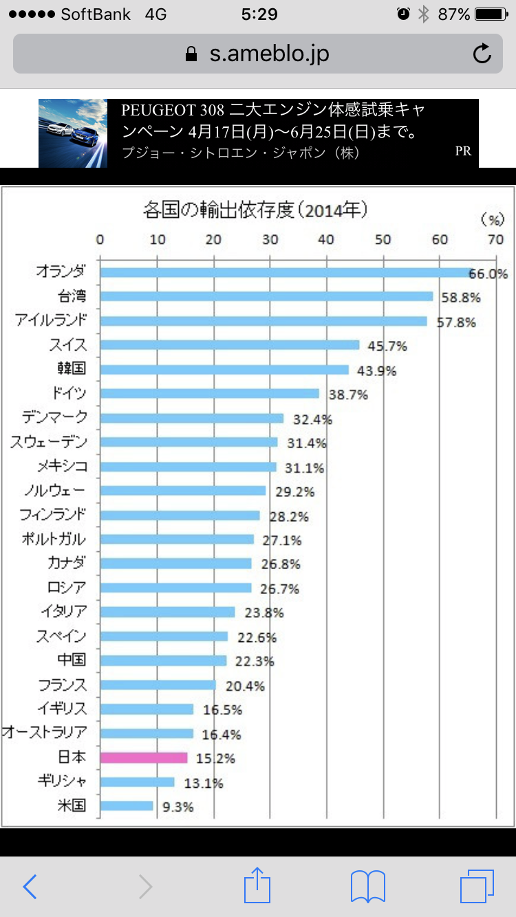 それに比べて日本の貿易依存度対GDP比は15.2%となってる。