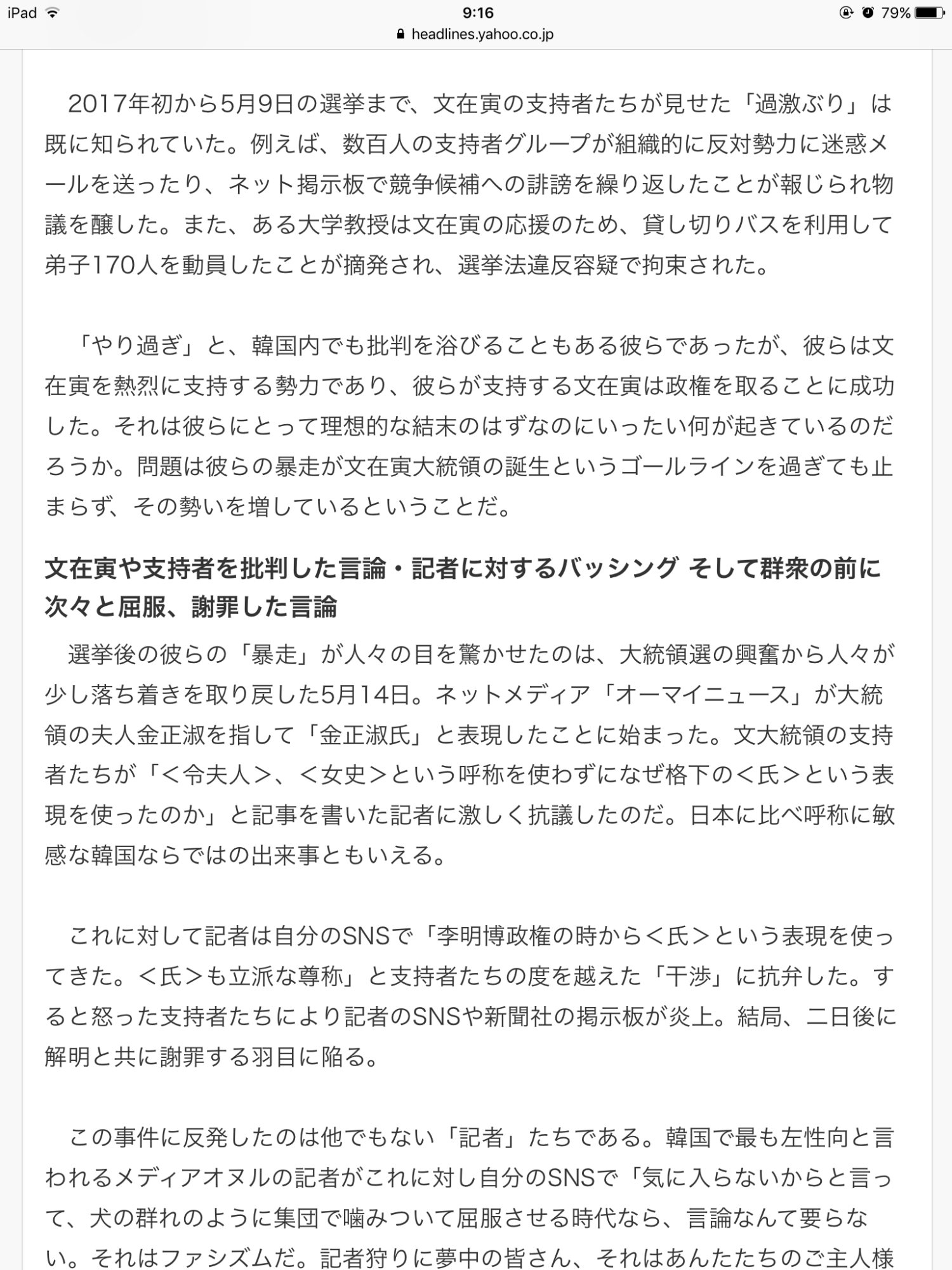 選挙後の彼らの「暴走」が人々の目を驚かせたのは、大統領選の興奮から人々が少し落ち着きを取り戻した5月14日。ネットメディア「オーマイニュース」が大統領の夫人金正淑を指して「金正淑氏」と表現したことに始まった。文大統領の支持者たちが「<令夫人>、<女史>という呼称を使わずになぜ格下の<氏>という表現を使ったのか」と記事を書いた記者に激しく抗議したのだ。日本に比べ呼称に敏感な韓国ならではの出来事ともいえる。