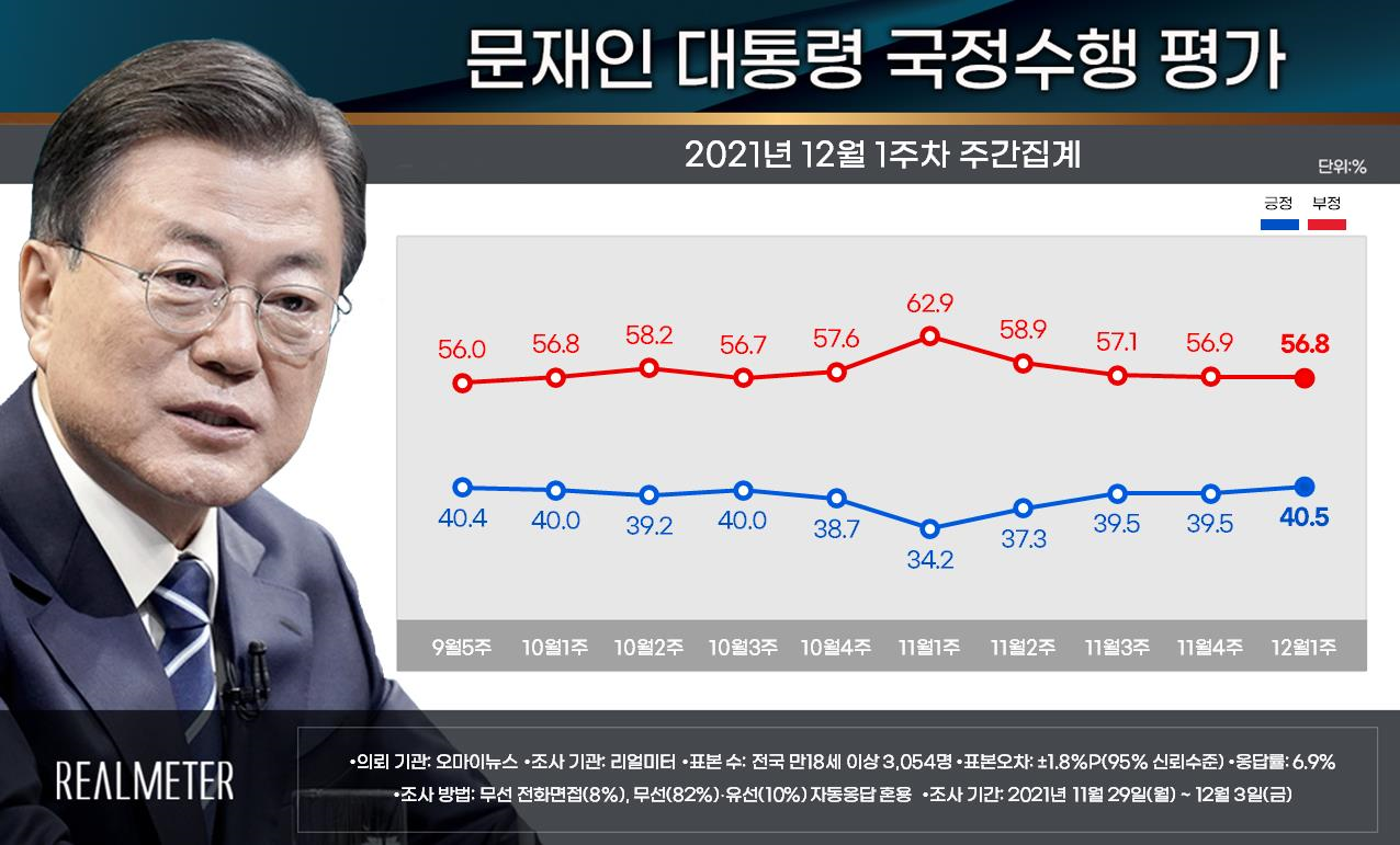 韓国の世論調査会社、リアルメーターが3日に発表した文在寅(ムン・ジェイン)大統領の支持率は34.1%、不支持率は61.7%に上った。文大統領の不支持率が60%を超えるのは初めて。支持率も就任後最低を更新した。