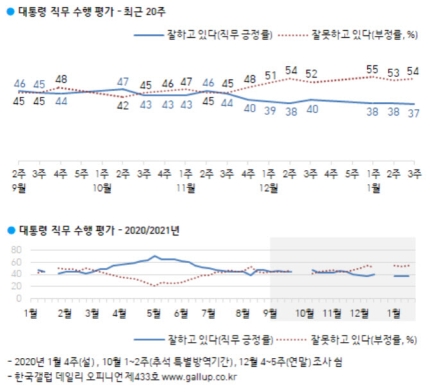 22日、世論調査専門機関の韓国ギャラップによると、1月3週に文大統領の支持率は就任後最低水準の37%を示した。