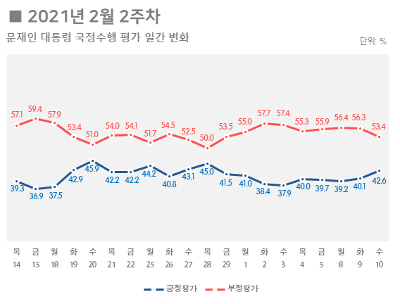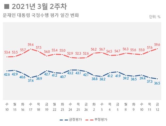 韓国ギャラップが27~29日まで全国18歳以上の1000人を対象に調査を実施した結果、文大統領の国政遂行に対する肯定評価は先週より2%ポイント下落した29%だった。