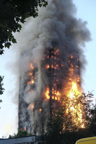 ロンドン西部の高層公営住宅で14日午前1時(日本時間14日午前9時)頃、火災が発生し、建物全体に燃え広がった。