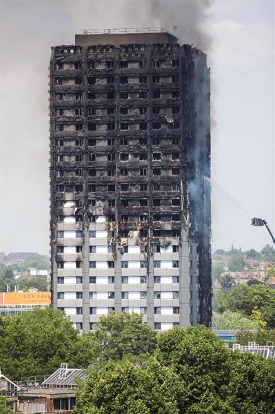 英BBC放送などによると、高層アパートは24階建ての低所得者用福祉住宅で、400~500人が住んでいた。建物の1階から3階までは公共施設などが入り、BBC放送は、その上にある住宅部分の4階付近が出火元である可能性があると伝えた。炎が外壁などを伝って、上層階に燃え広がったとみられる。