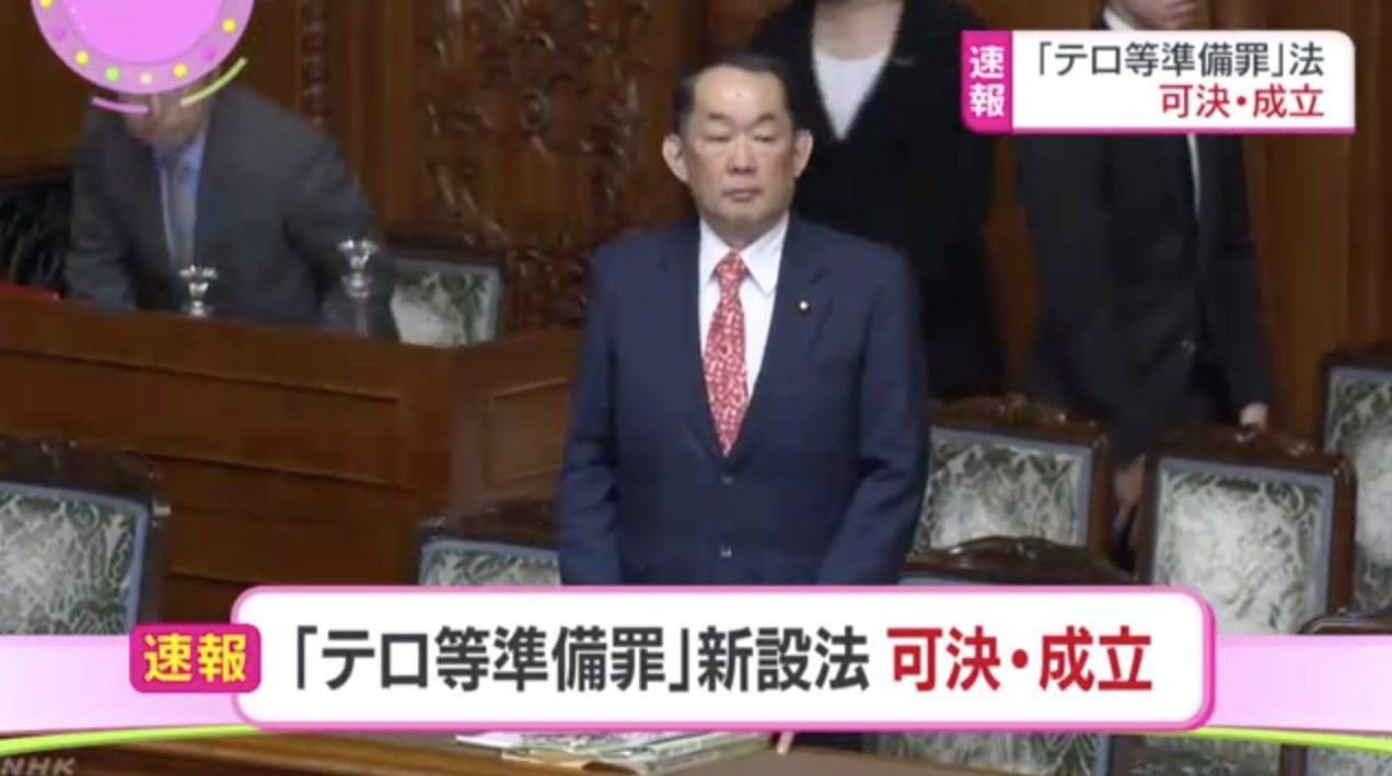 共謀罪の構成要件を厳格化した「テロ等準備罪」を新設する改正組織犯罪処罰法は15日午前の参院本会議で、与党などの賛成多数で可決、成立した。