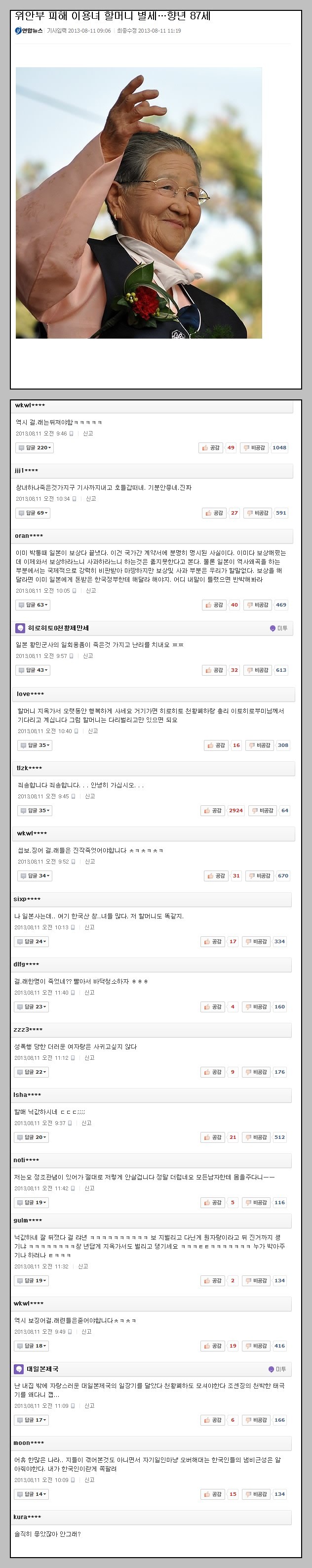 기사제목 : 위안부 피해 이용녀 할머니 별세... 향년 87세.