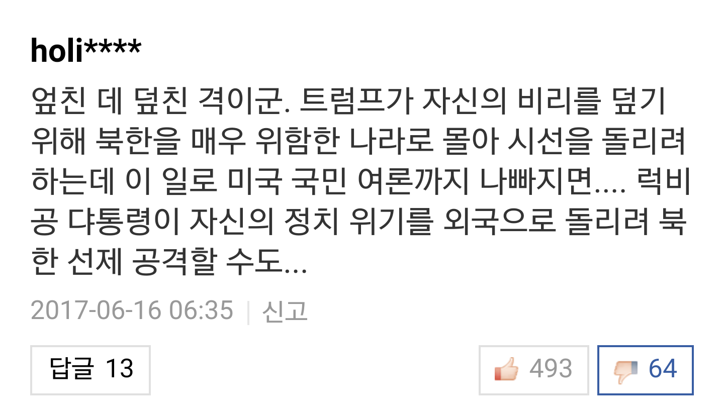 泣き面に蜂だな。トランプが自分の不正を覆うルドために、北朝鮮を非常にためで国運転視線を向けようハヌンデイ日、米国民の世論まで悪くなる....ラグビーボール댜大統領が自分の政治危機を外国に回そうブックした先制攻撃することもできる韓国掲示板では、ありふれた日常じゃん?
