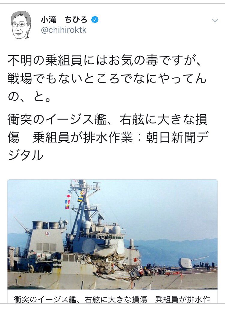 朝日新聞編集委員の「小滝ちひろ」さんがツイッターで「戦場でもないところで何やってんの」と衝突事故で浸水した船室に閉じ込められ死亡した、フィッツジェラルドの乗務員の7人を嘲笑した。