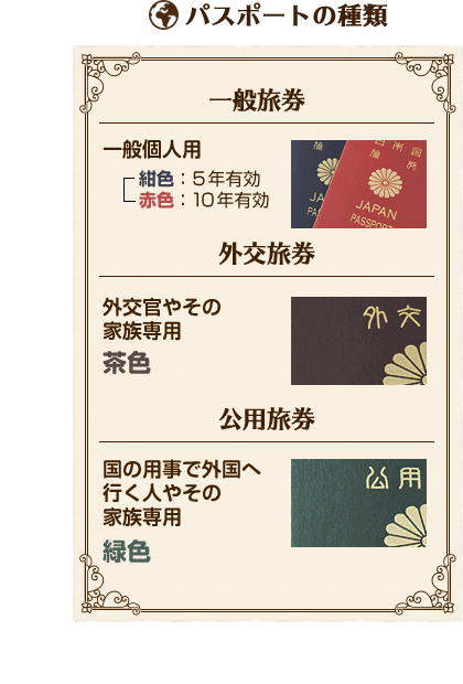 緑色のパスポートは公用旅券に区分され、国の用務で渡航する人や、その同伴者に発給されます。国会議員、一般の公務員、公的機関の職員、文化庁の認める在外研修員などがそれに当たります。表紙には「OFFICIAL PASSPORT」の表記があります。