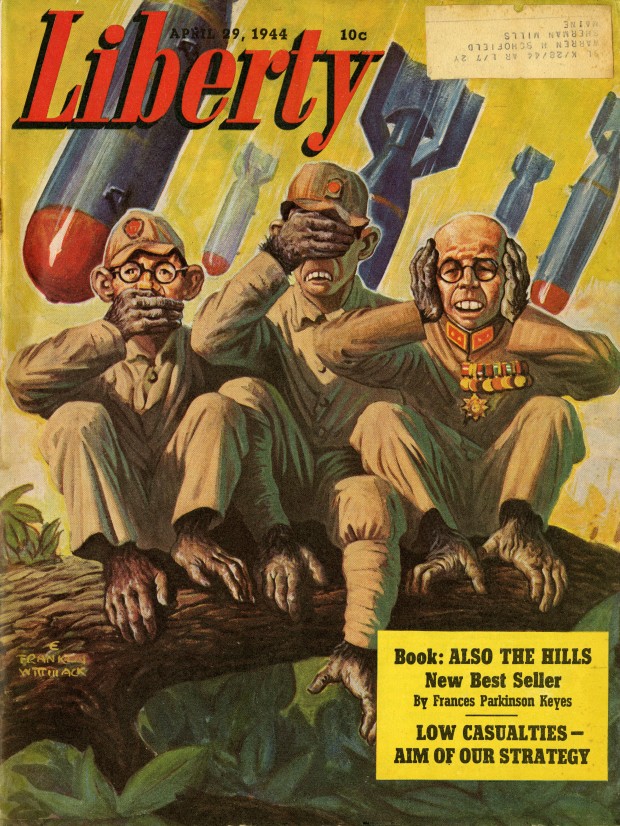 お前は毎日、台所にある便器にクソしてるのか?This is a cover from Liberty Magazine published on April 29, 1944. The cover is quite shocking and depicts Japanese soldiers in a very derogatory manner. Perched on top of a tree limb within the jungle sit three Japanese soldiers (two privates and one decorated officer…who resembles Japan’s General and Prime Minister Hideki Tojo) with bombs falling in the background. Their hands and feet in this artistic rendering feature ape like features, exaggerated teeth, and posed in the famed speak no evil, see no evil, and img014hear no evil pose. The history of the “three wise monkey” idiom, in a twist of fate is tied to a Chinese Buddhist and Confucian proverb that spread to Japan by the 17th Century. To provide context for this image, strategic bombing of Japan started two months later in June of 1944 and would last until the end of the war. The illustrator Edgar Franklin Wittmack, a veteran of World War
