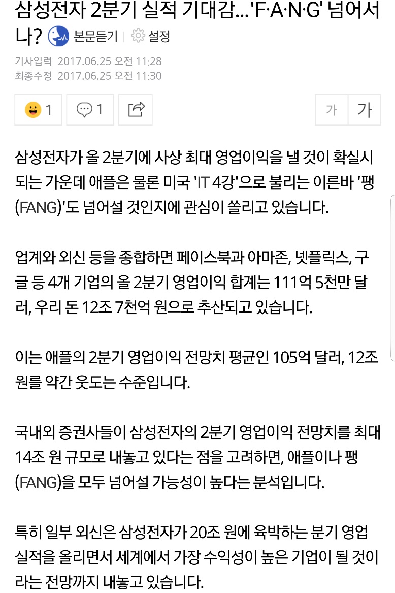 삼성전자 2분기 영업이익전망치를 한국 언론은 1.4~1.5조엔으로 예상하고 있고..