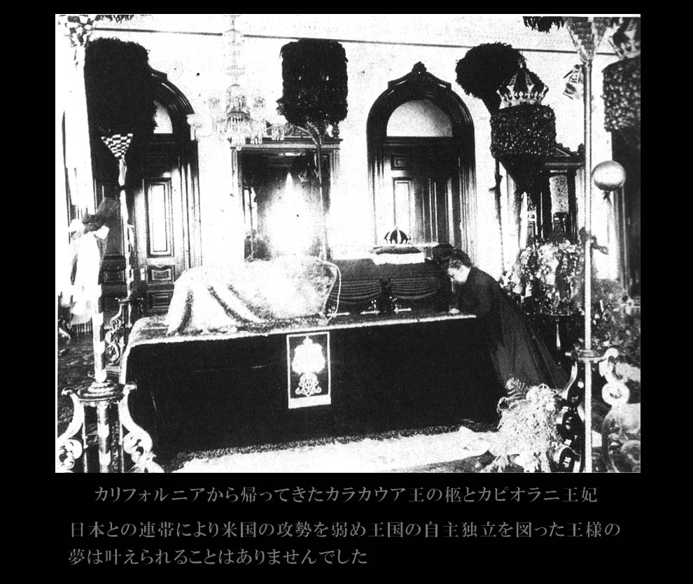 1900年、アメリカがハワイを併合。この時、ハワイで一番多いのは日系人だった。日本はアメリカに怒り、ハワイに戦艦を送るが、結局戦争はしなかった。1908年には、アメリカが日系人の移民を禁止する。日本は人口によって白人と均衡し、戦争せずに勝とうとしていたが、それも不可能になった。王位に就いたカラカウア大王が、明治14年(1881年)に来日するのです。この頃の日本は「有色人種で唯一の独立国」であり、日本はアジアにおける有色人種の「希望の光」であったのです。そしてこれが外国の王が日本にやって来た最初の出来事となりました。