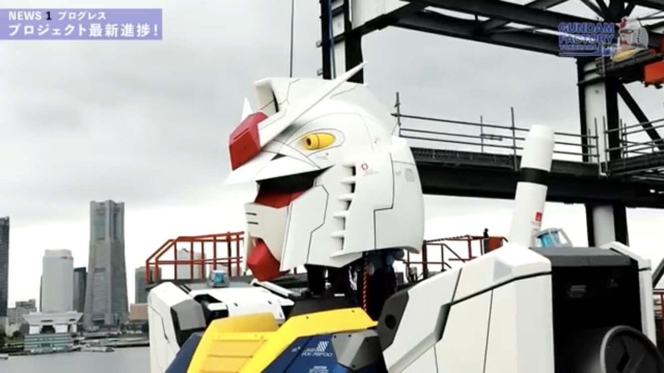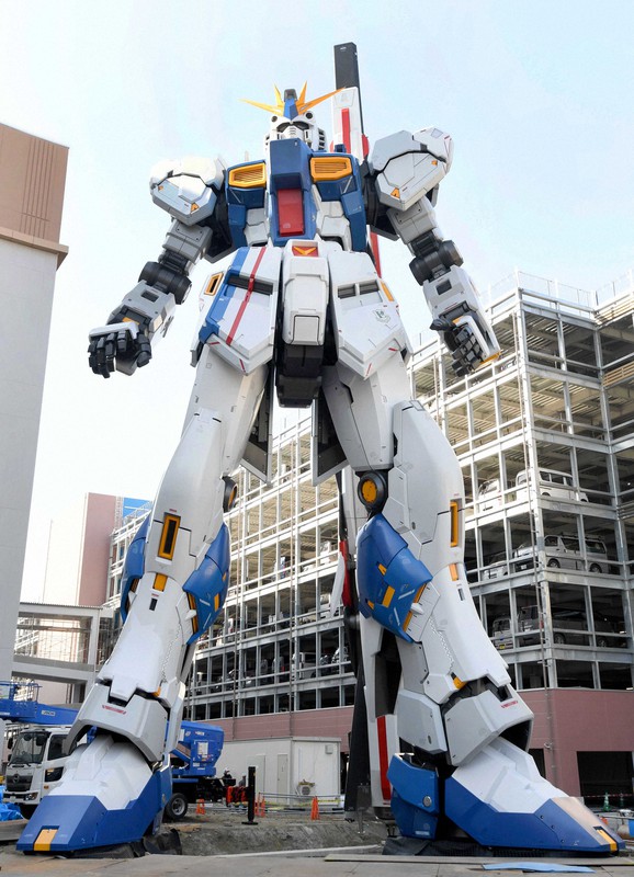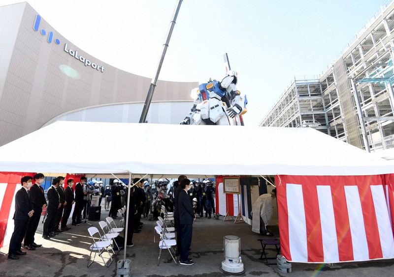 バンダイナムコグループは22日、福岡市博多区で来春開業予定の「三井ショッピングパーク ららぽーと福岡」に建設中の人気アニメ「機動戦士ガンダム」の実物大立像に頭部を取り付ける上頭式を開いた。