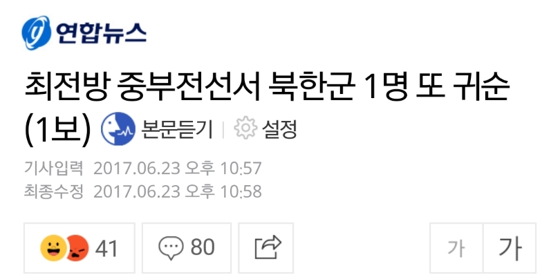 속보) 북한군. 중부전선에서 또 귀순..