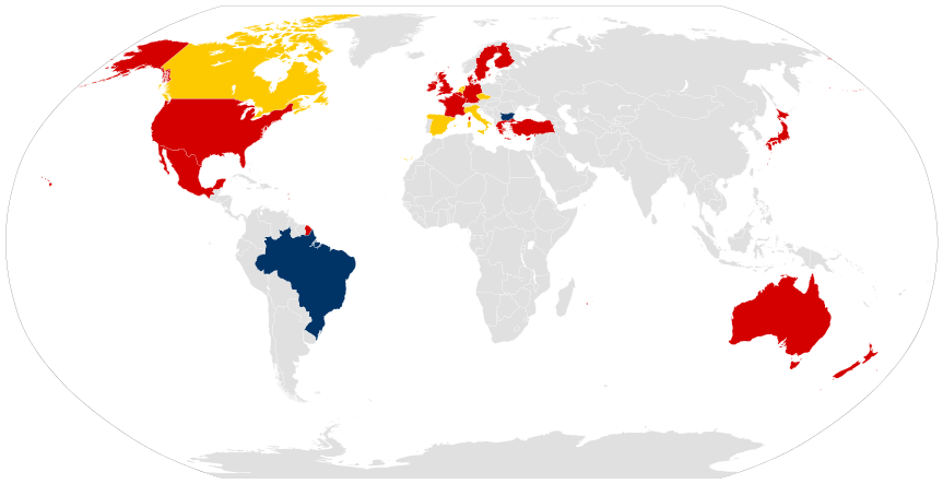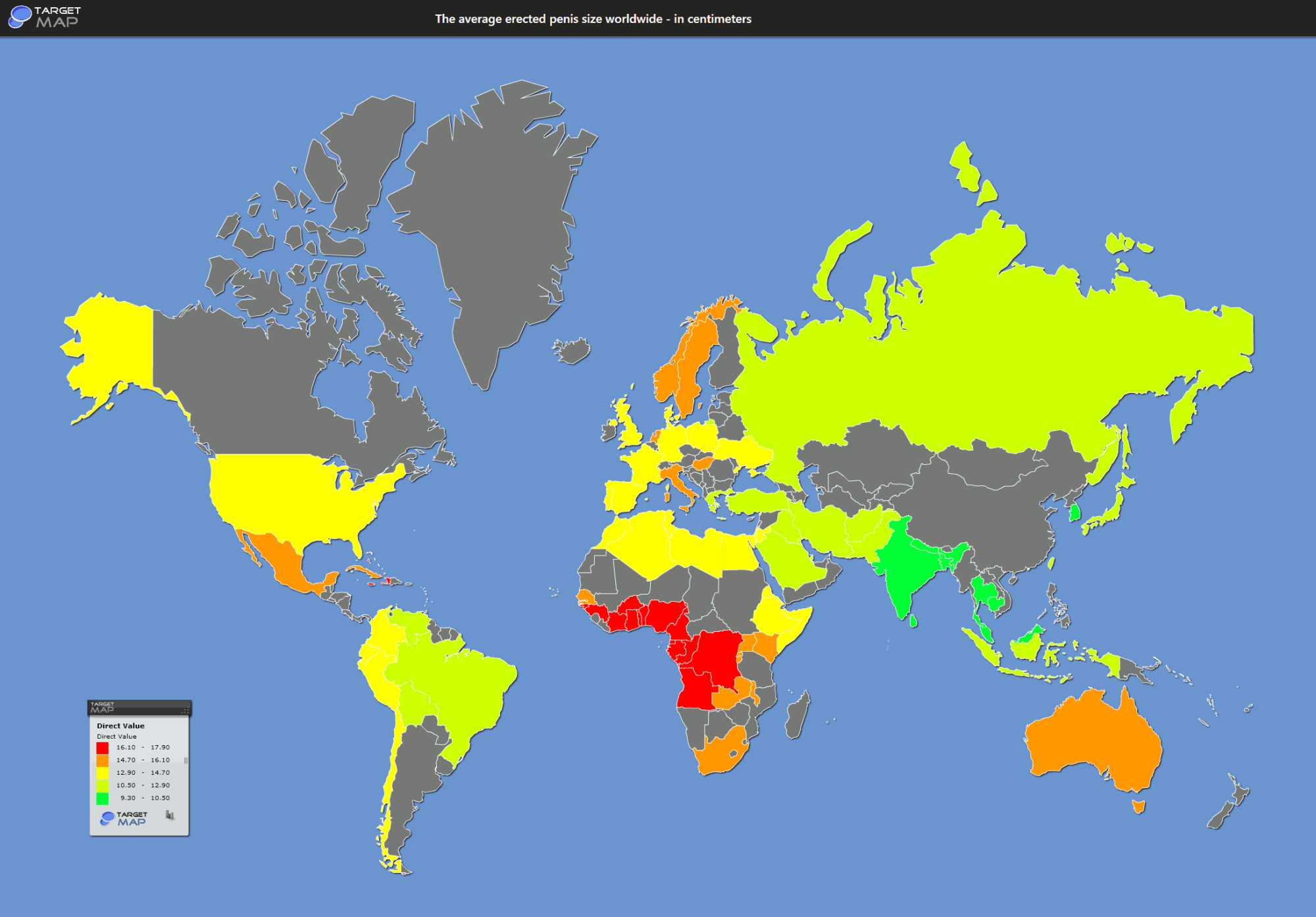 国は、7つの均等に配置されたビンに配置され、それらの投稿のパーセンテージに応じて青から赤に色付けされます。